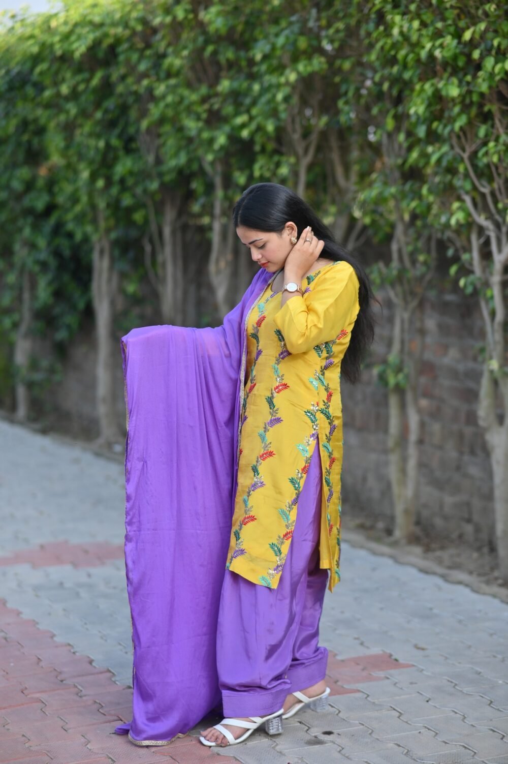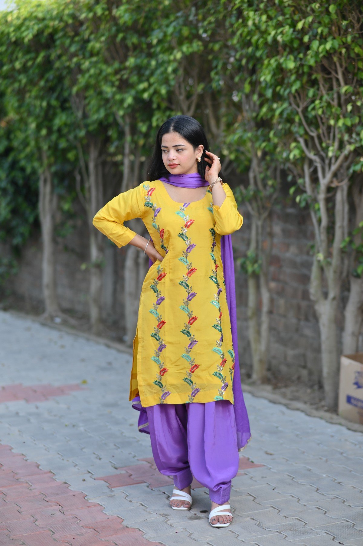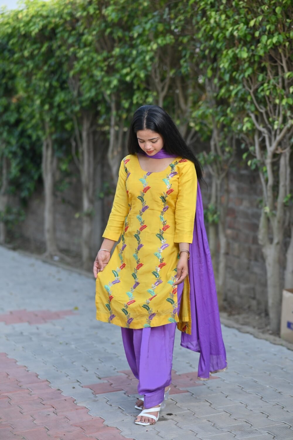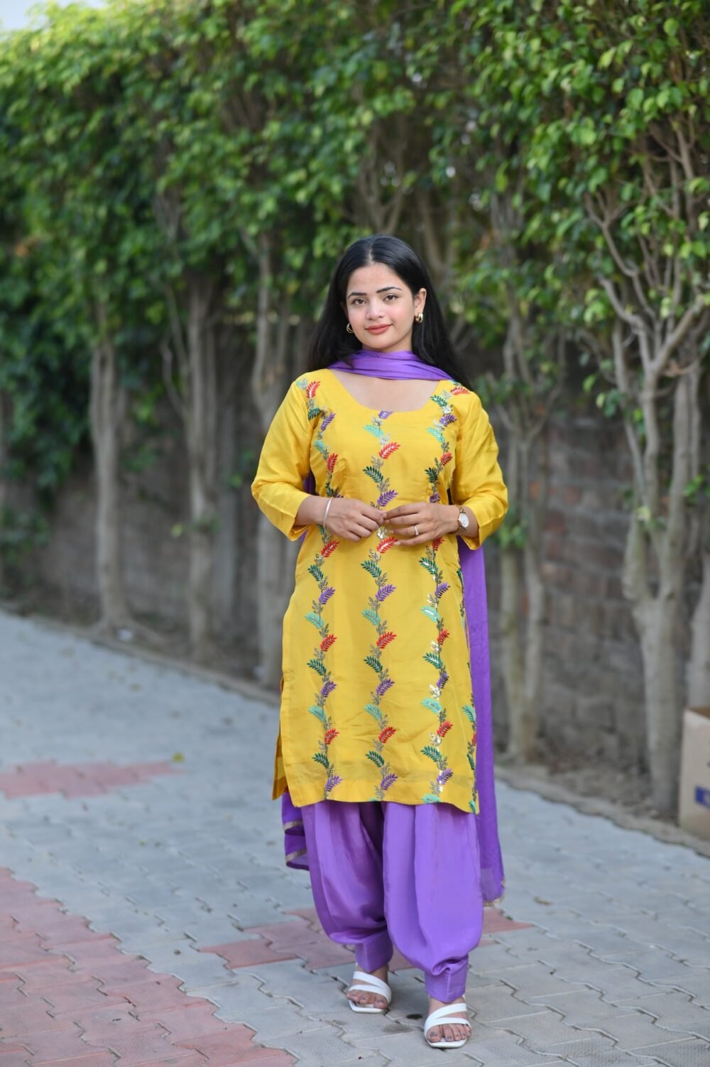Brighten your day with our Lavender Sunshine Patiala Suit Set, featuring a mustard-yellow kurta beautifully embroidered with multi-colored leaf motifs. Paired with a vibrant lavender Patiala salwar and matching dupatta, this ensemble blends joyful hues with graceful design—perfect for festive occasions, casual gatherings, or daytime celebrations.