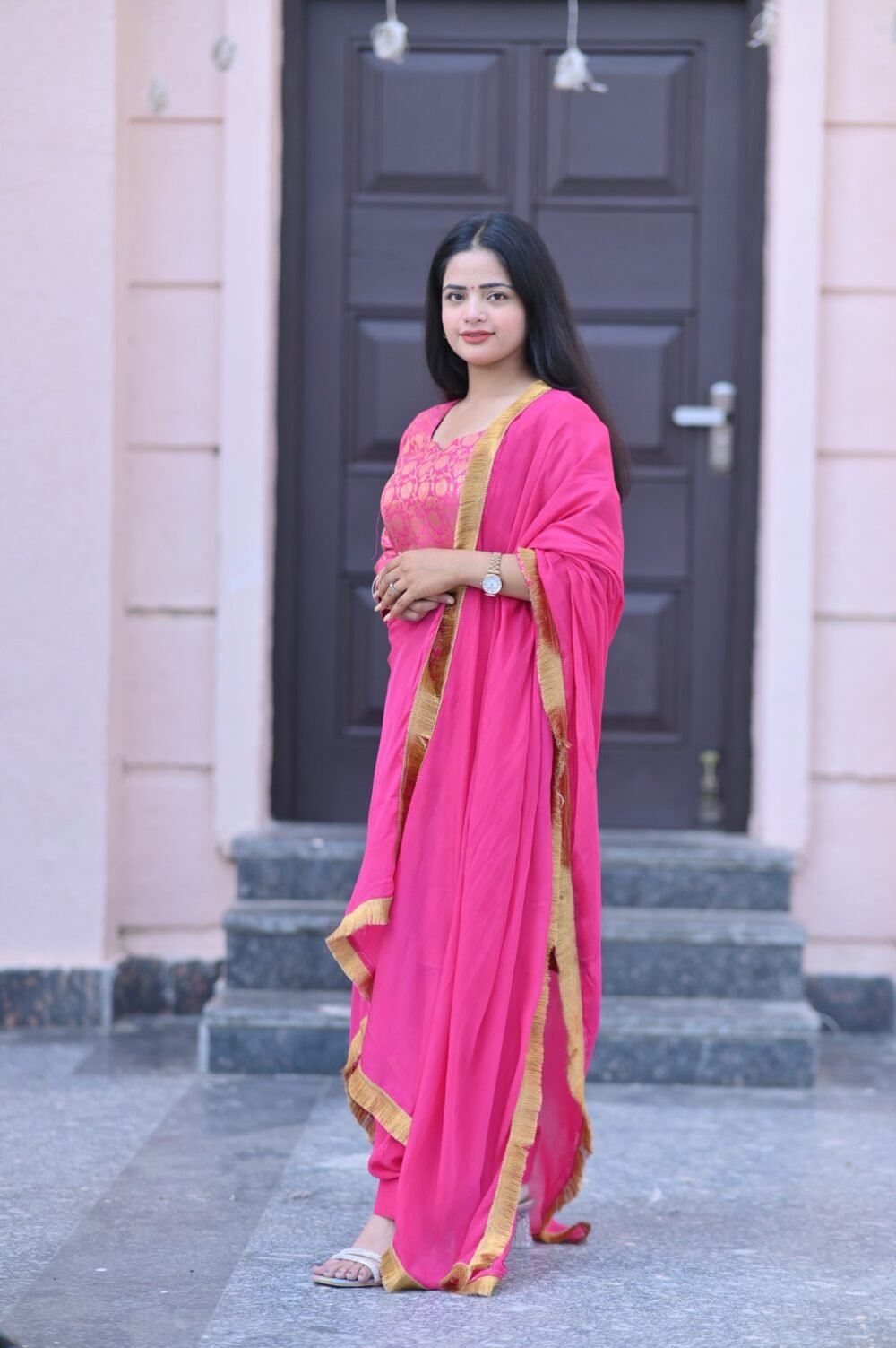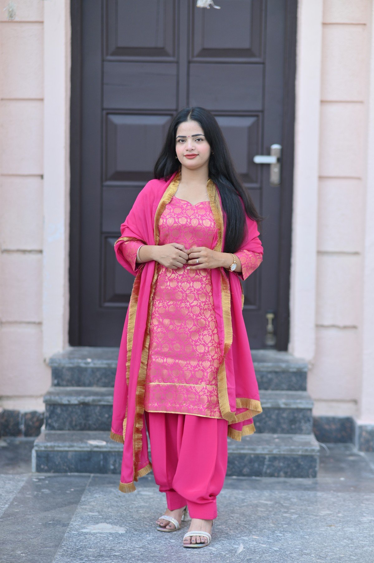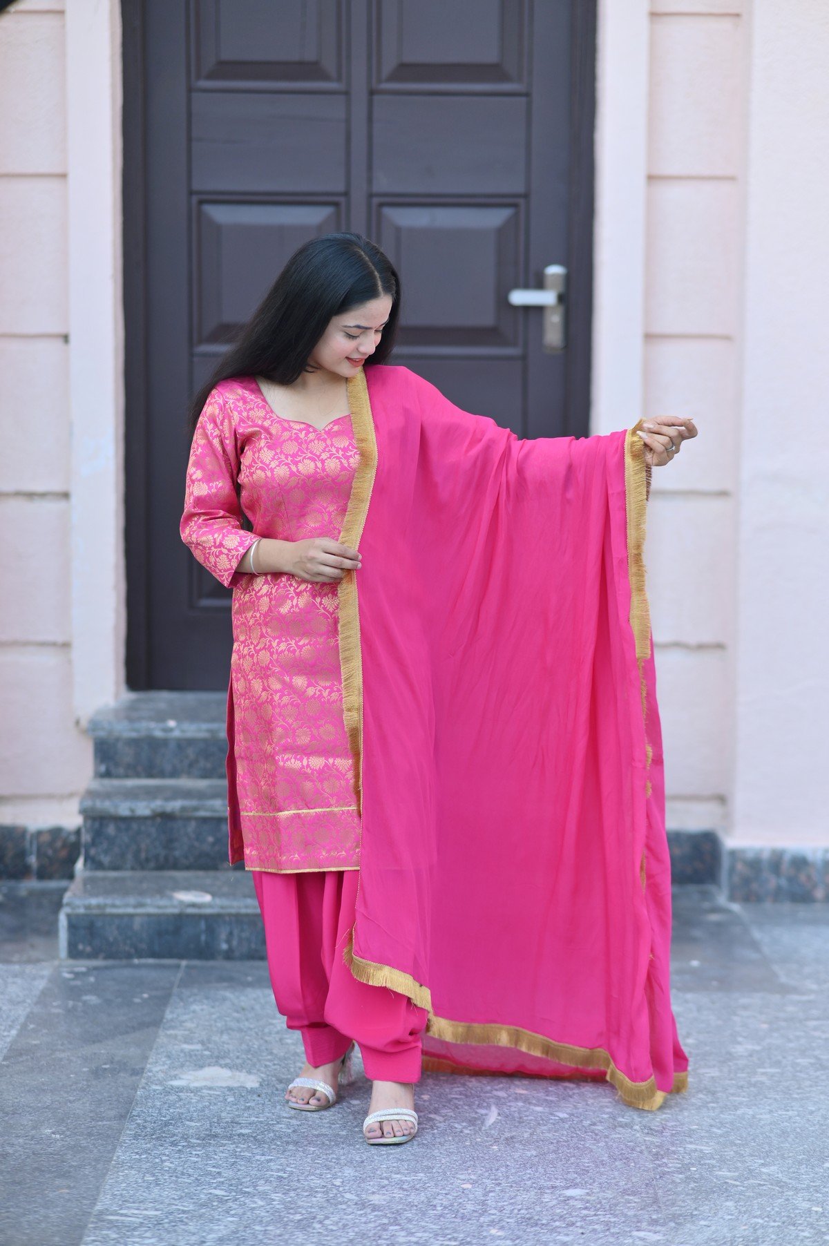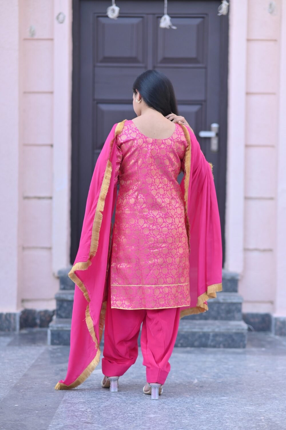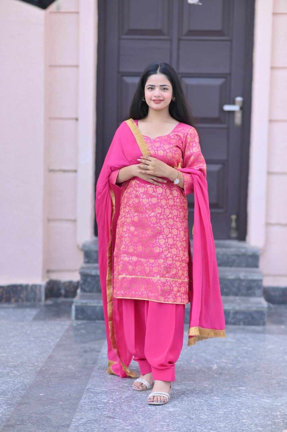 Add a touch of timeless grace to your ethnic wardrobe with our Pink Brocade Silk Suit Set. Crafted from luxurious silk fabric, this elegant ensemble features intricate golden brocade weaving that radiates festive charm. The bright pink hue, complemented with a matching dupatta bordered in gold, creates a perfect balance of richness and sophistication.