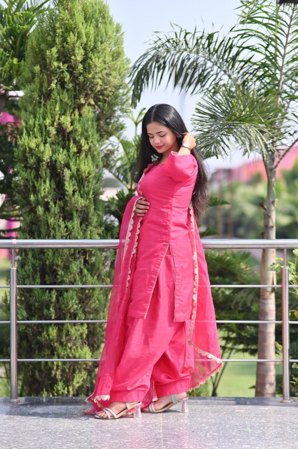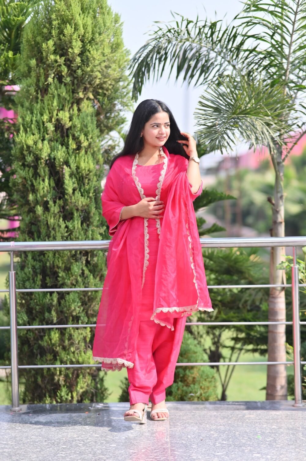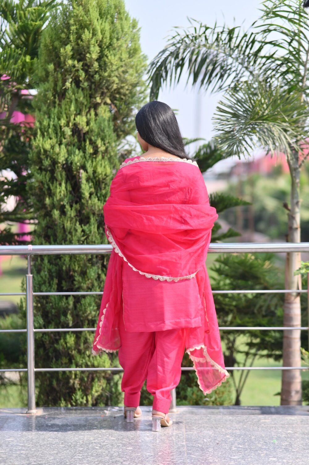 Charming Pink Raw Silk Suit Set adorned with delicate lace detailing. Crafted from soft, lustrous fabric for a graceful and comfortable festive look. Perfect for weddings, parties, and elegant celebrations. The intricate craftsmanship adds a luxurious touch to your traditional wardrobe. Pair it with statement jewelry to complete your sophisticated ensemble.