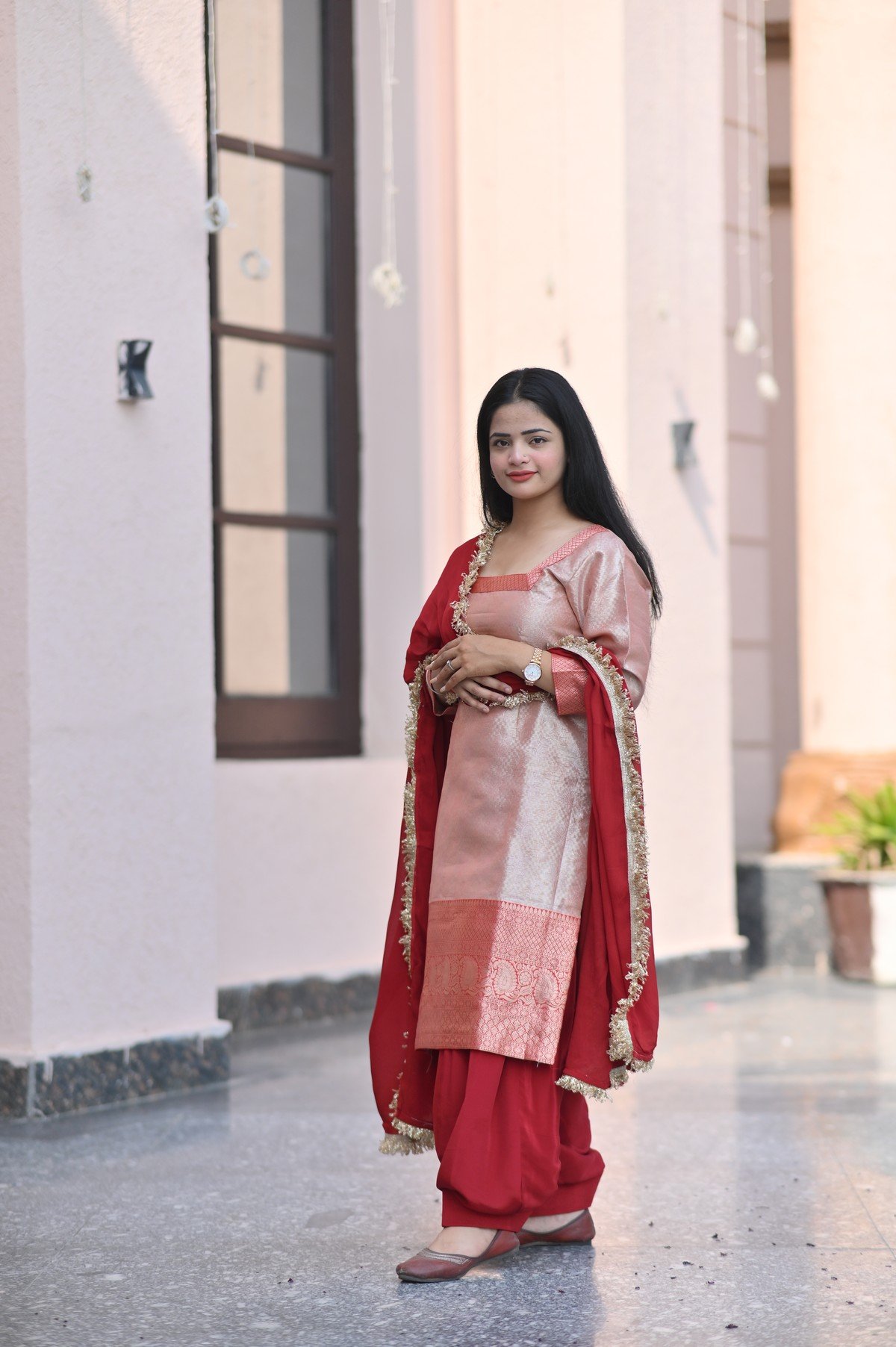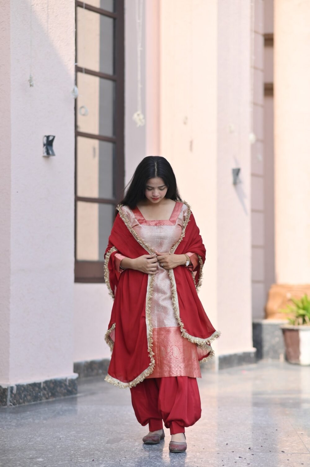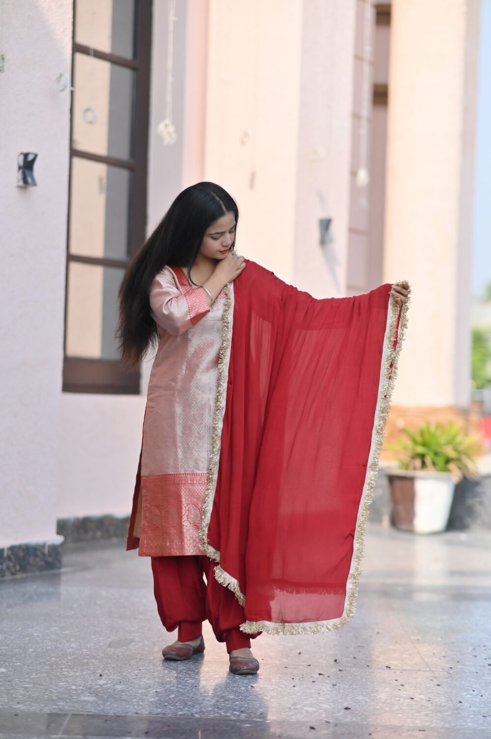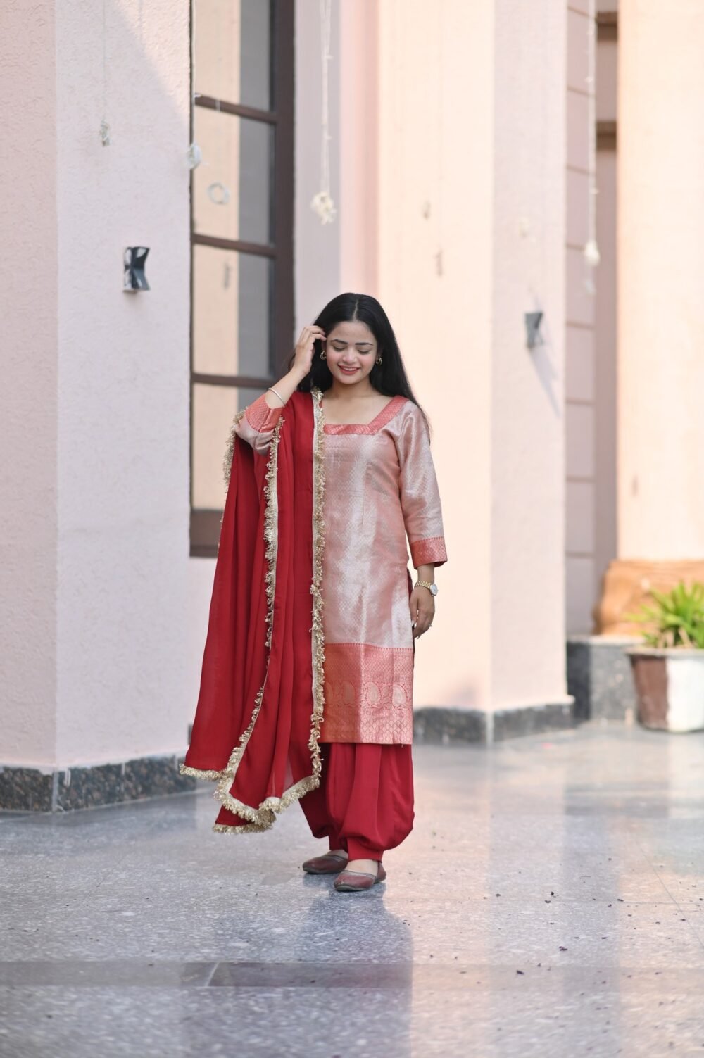 Radiate charm in the Rose Aura Suit Set, where soft blush tones meet bold red accents. Crafted with rich fabric and detailed trims, this look is perfect for festive gatherings and intimate celebrations alike.